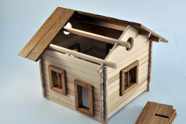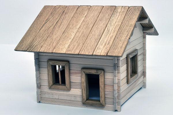 Miniatura domu mieszkalnego z bali drewnianych i dwuspadzistym dachem.
